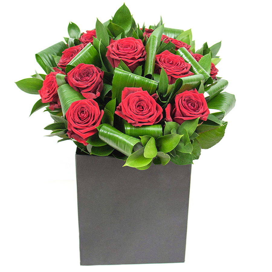 Celebrate elegance with our luxurious red rose arrangement, featuring vibrant red roses, rich aspidistra leaves, and delicate ruscus. This bouquet is a perfect statement piece for any setting.