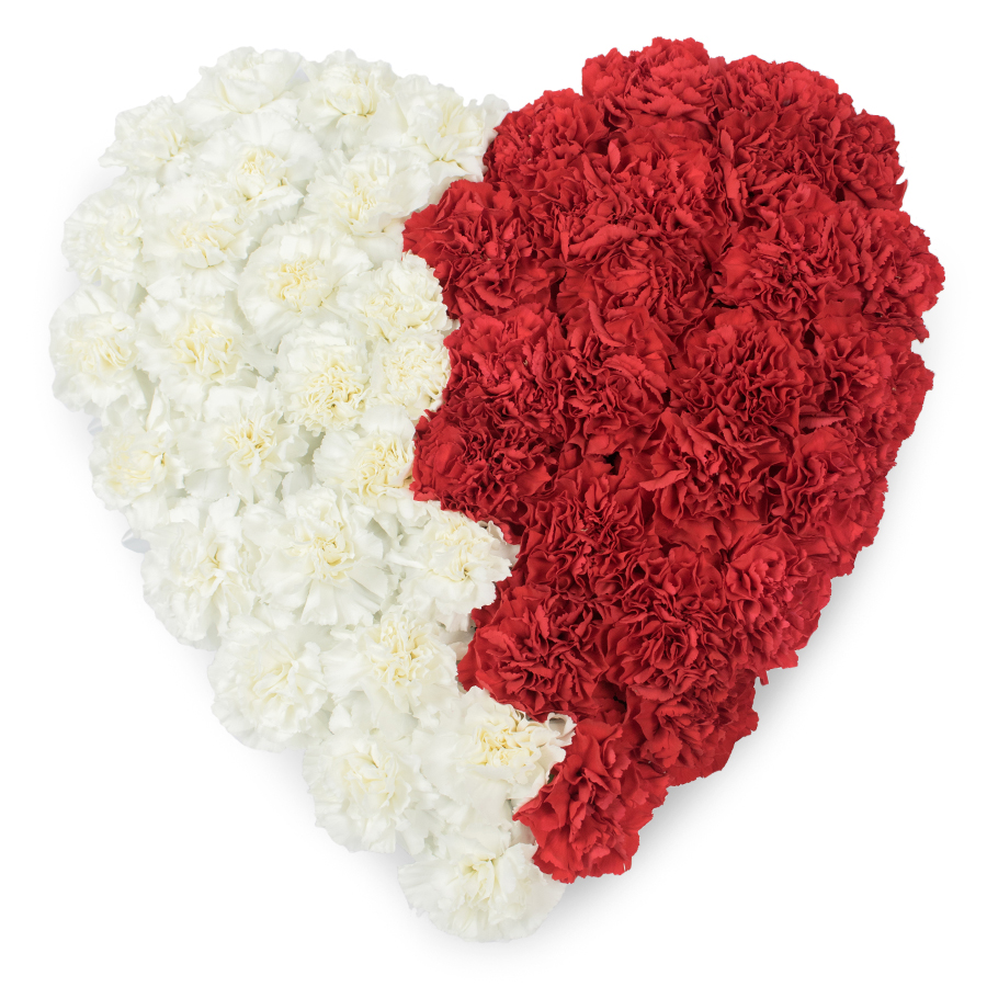 Handy Flowers' Radiant Mixed Carnations Heart is a stunning bouquet featuring a vibrant mix of white and red carnations, perfect for expressing sympathy and heartfelt emotions.