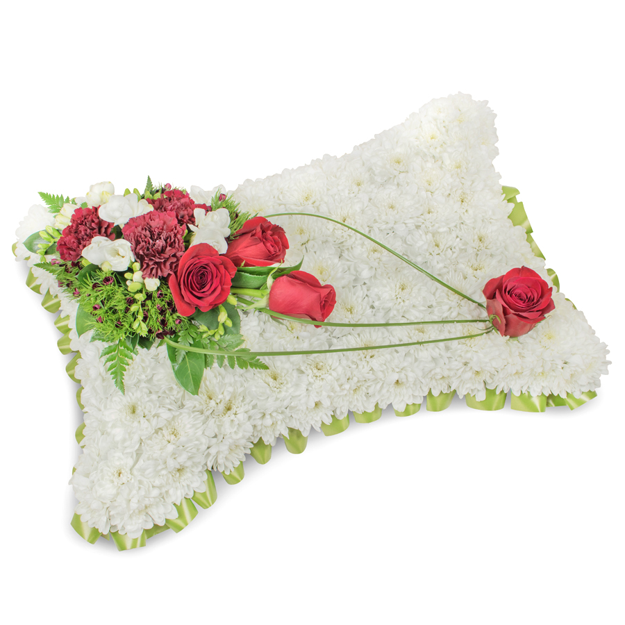 Convey your deepest sympathies with our exquisite and distinctive flower arrangement. This bouquet combines white chrysanthemums, red roses, white freesias, dark red carnations, dianthus, and bear grass to create a visually stunning and comforting tribute.